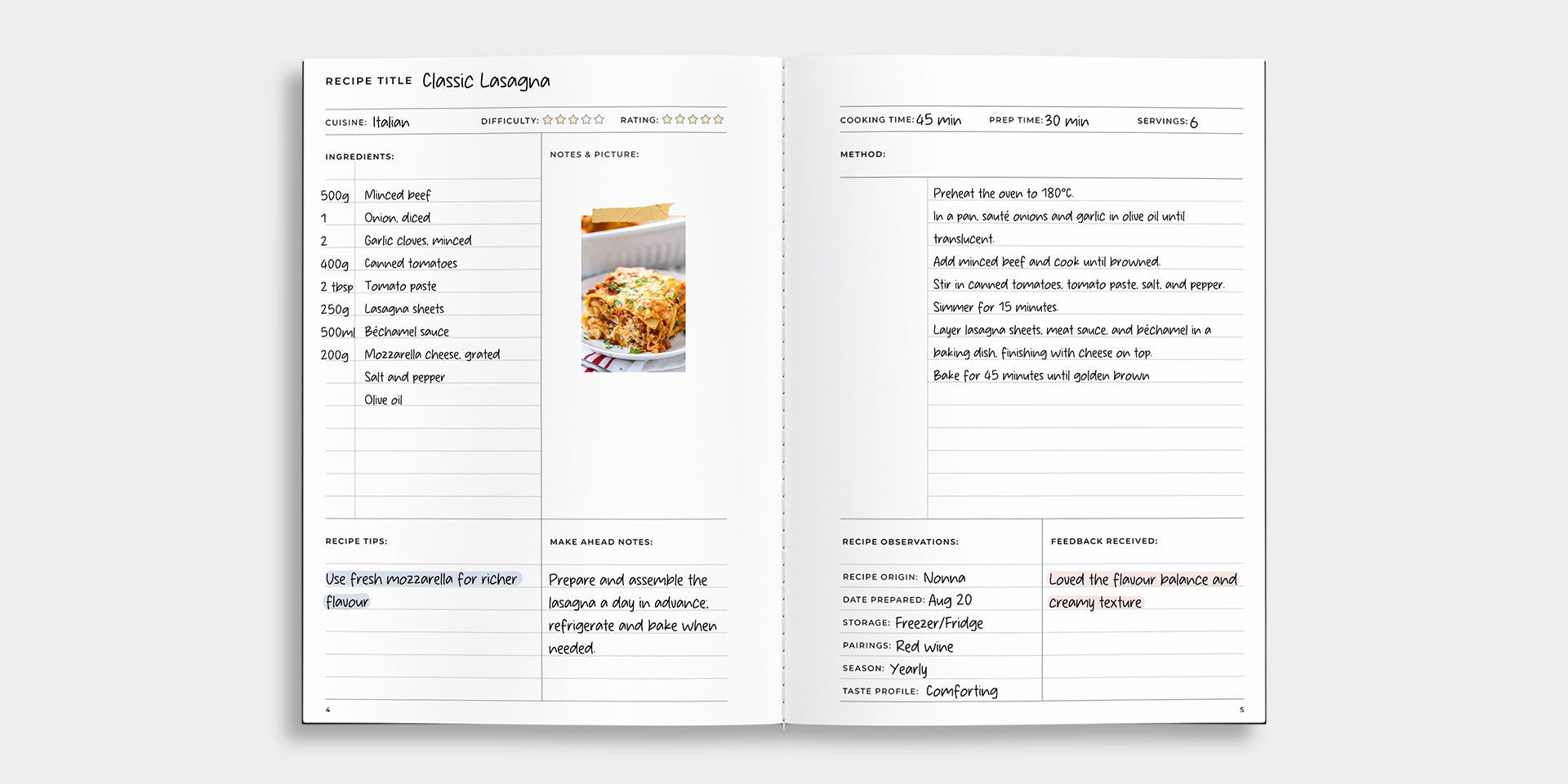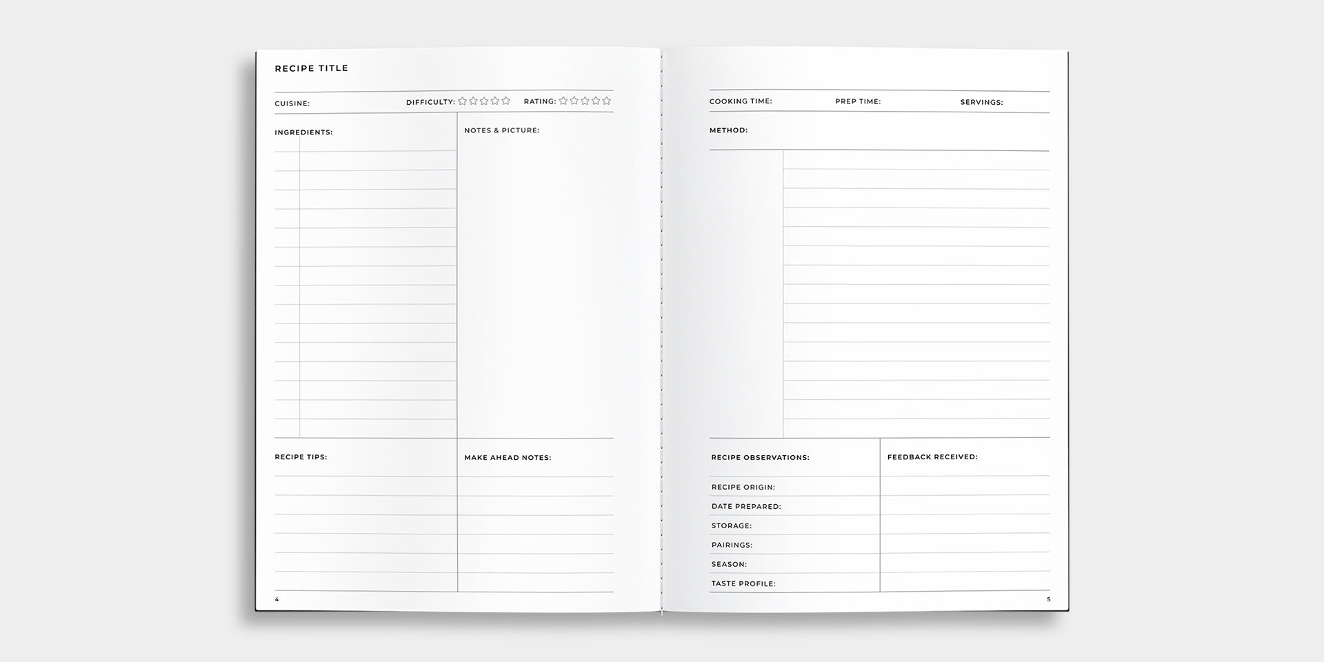 24 x Recipe Pages: Everything you need to master your favourite meals at a glance. Track cooking time, servings, and difficulty, log ingredients and step-by-step methods and refine your dish with taste notes, storage tips, and flavour tweaks. There’s even space for ideal pairings, adjustments, and feedback from your toughest critics (aka taste testers).