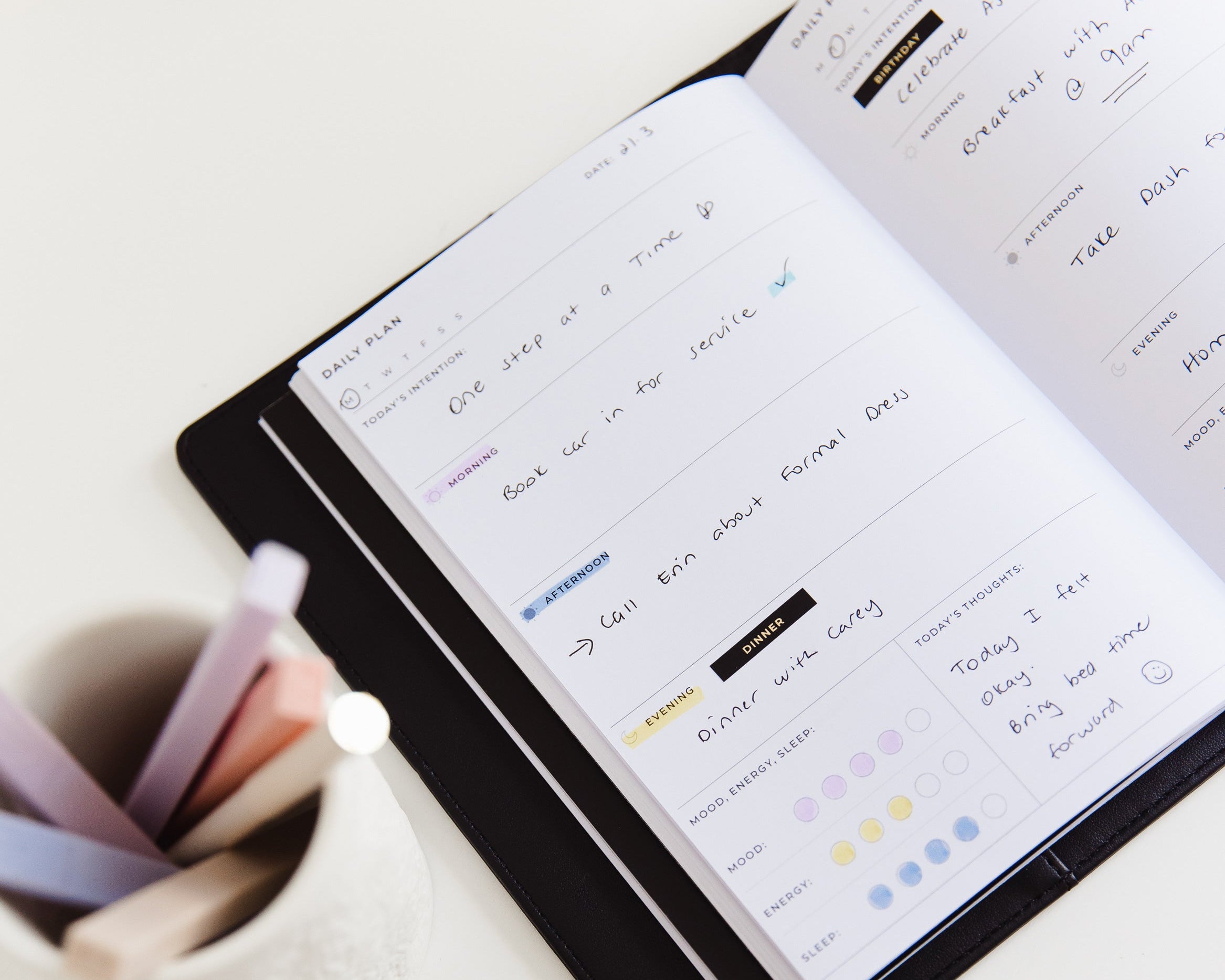 I love my weekly planner. It has everything I need and a beautiful, simple layout that allows me to add all the things I need to remember to do through the day, with extra space on top and below for notes.