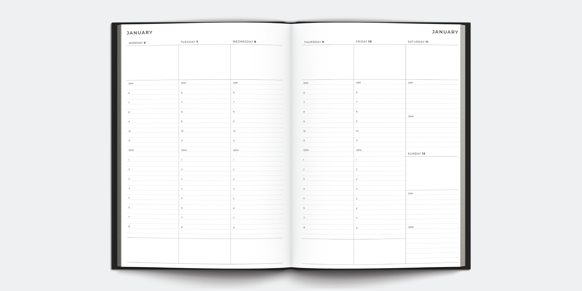 Weekly Spread: Week to view, double page vertical spread from January 2026 to December 2026