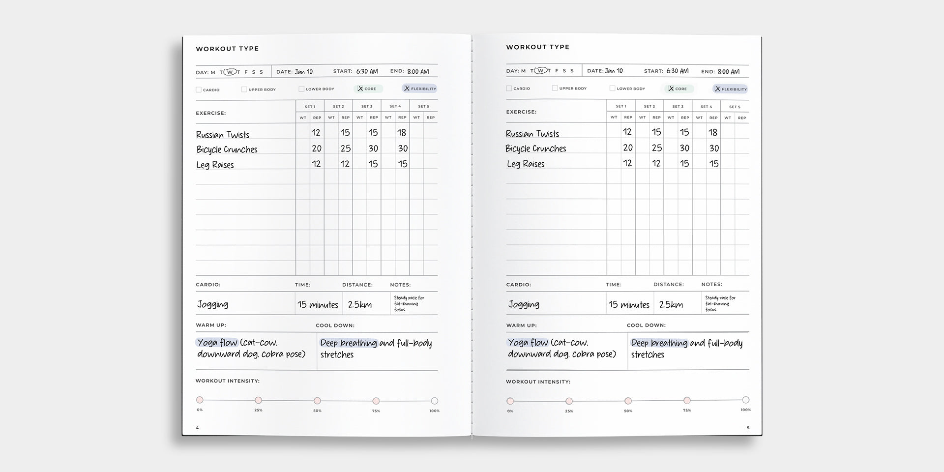 2 x Workout Index: A quick-reference section to log workouts, making it easy to track consistency and milestones over time