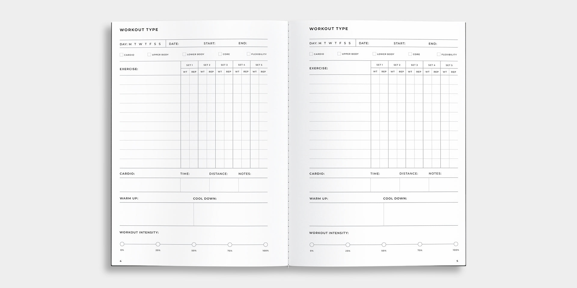 48 x Workout Daily Tracking Pages: Structured daily workout logs with space for exercises, sets, reps, cardio details, warm-up and cool-down routines and intensity tracking